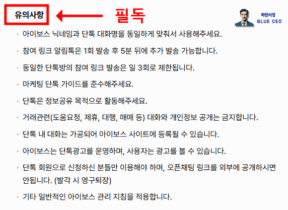 카톡방 입장 후 반드시 지켜야할 수칙이 있다. 이 수칙을 어길경우 영구 추방 당할 수 있으니 반드시 필독할것!