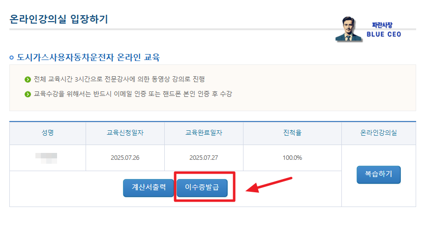 이제 '이수증 출력' 누르면 마을 버스기사 OR 버스기사 취업하는데 필요한 CNG이수증을 제출할 수 있게 되었다.