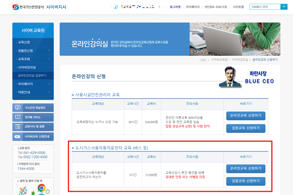 그리고, 위 버튼을 눌러서 해당 사이트로 이동해서 '도시가스사용자동차운전교육(버스등)'을 클릭해서 온라인/집학 교육중 본인이 편한걸 선택해야한다.
