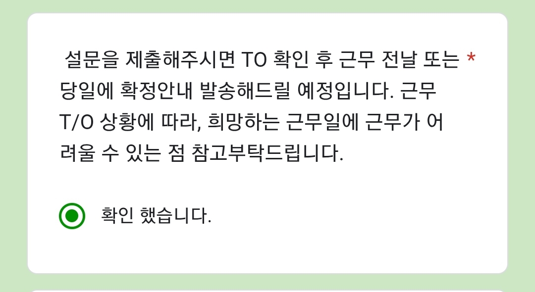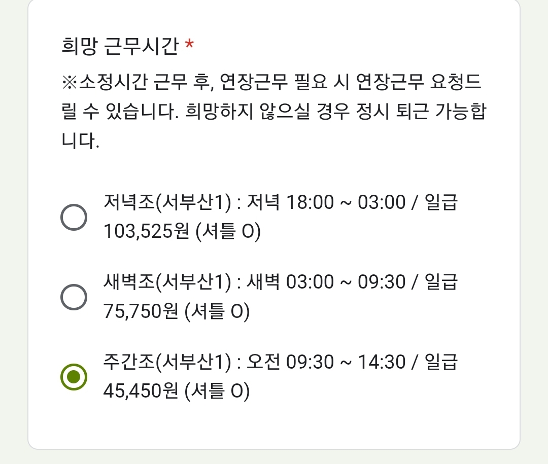 위 사진처럼 내가 원하는 시간대에도 지원 가능하다. 나의 경우 요새 알르레기 기운으로 몸이 안좋아서 돈좀 덜 받더라도 몸 안상하게 '주간조'를 선택했다.
