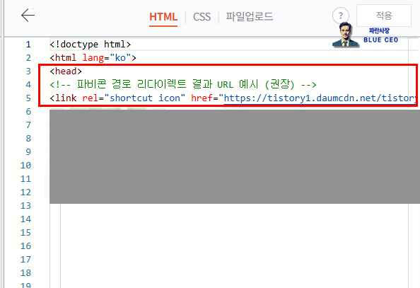 위 코드 파비콘 링크 주소라고 적힌 부분 "" 사이에 나의 파비콘 주소 넣고