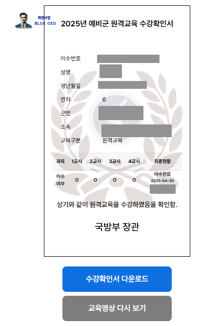 내가 원격 교육을 잘 이수했는지 확인하려면 교육을 전부 다 듣고나서 '예비군 원격교육' 홈페이지에 다시 로그인하고 접속하면 확인할 수 있다.
