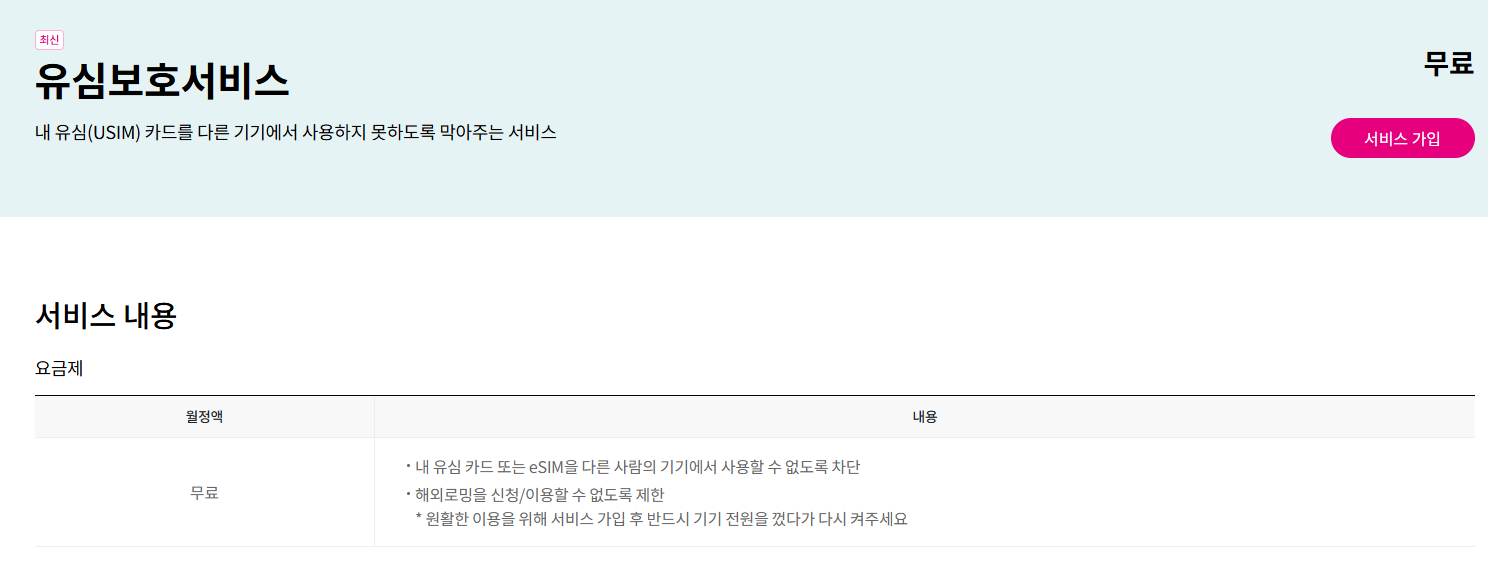 | 🔒 주요 기능 | - 내 유심(USIM) 또는 eSIM을 다른 기기에서 사용하지 못하게 차단 - 해외로밍 신청/이용 제한 |